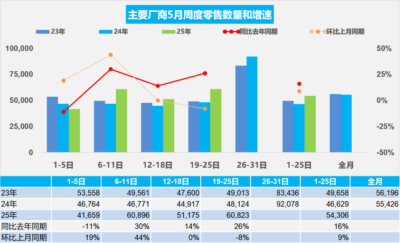 5月1-25日,全国乘用车市场零售135.8万辆,同比去年5月同期增长16%,较上月同期增长9%。今年以来累计零售823万辆,同比增长9%。