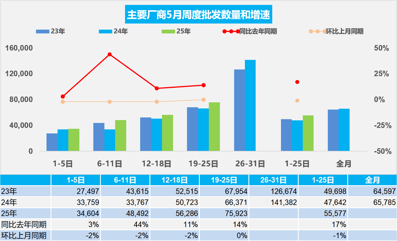 5月1-25日,全国乘用车厂商批发138.9万辆,同比去年5月同期增长17%,较上月同期下降1%;今年以来累计批发985.8万辆,同比增长12%。